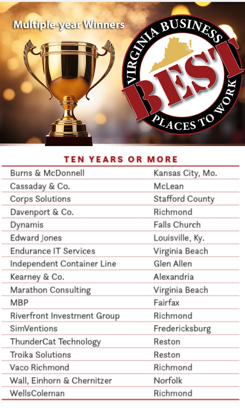 This statewide survey and awards program is designed to identify, recognize and honor the best places of employment in Virginia, benefiting the state's economy, its workforce and businesses. The Best Places to Work in Virginia list is made up of 100 companies. Companies from across the state entered the two-part survey process to determine the Best Places to Work in Virginia. The first part consisted of evaluating each nominated company's workplace policies, practices, philosophy, systems and demographics. The second part consisted of an employee survey to measure the employee experience.